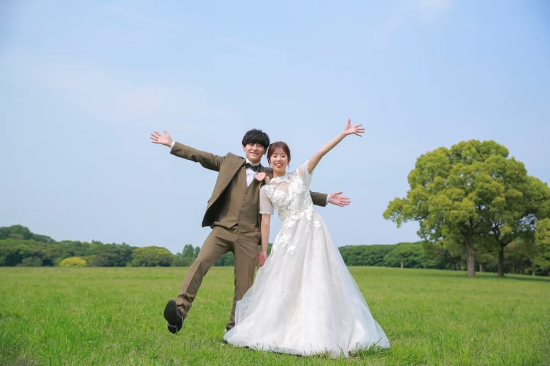 ふたりの喜びを表現したいときには、大きく手を広げるポーズがおすすめ。手を広げて空を見上げる姿は、未来に対する期待感や高揚感を表すことができます。