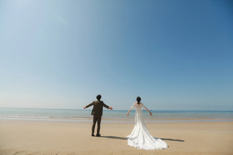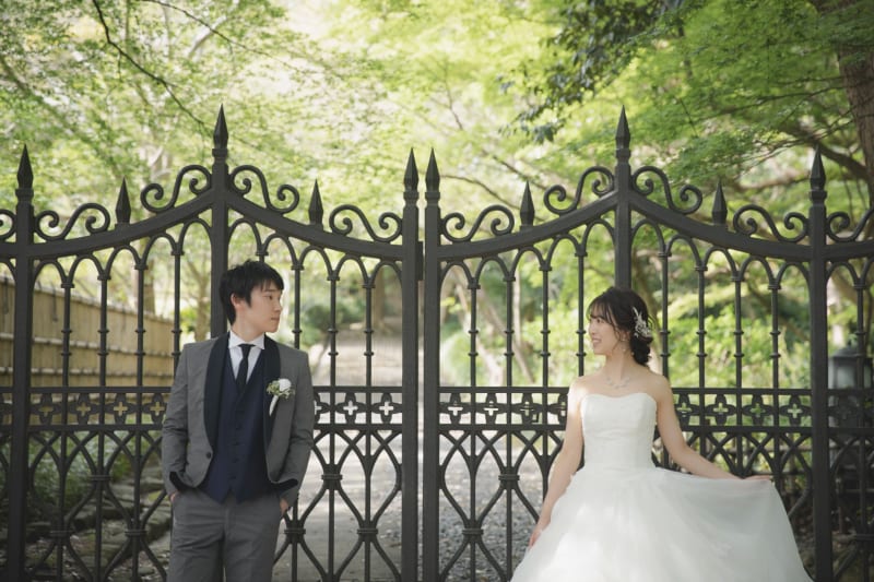 ウェディングフォトは、ふたりで寄り添うショットが多いからこそ、すこし距離を空けた写真に挑戦を。撮影した写真は、爽やかな印象になるので、インテリアや結婚報告をするときの挨拶状に添えても素敵です。