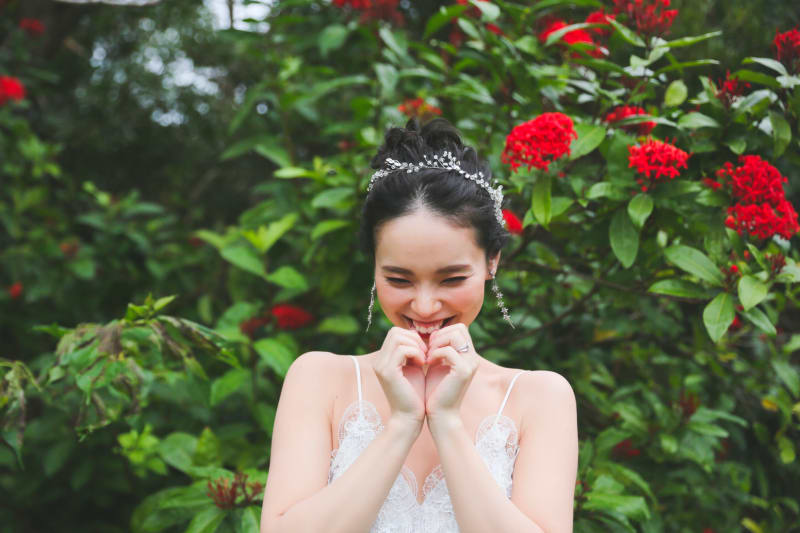 カジュアルで柔らかな雰囲気を出すためには、ピースサインやハートのハンドサインを使うのがおすすめです。慣れたハンドサインで撮影すれば、お互いリラックスでき、和やかにウェディングフォト撮影が進められます。