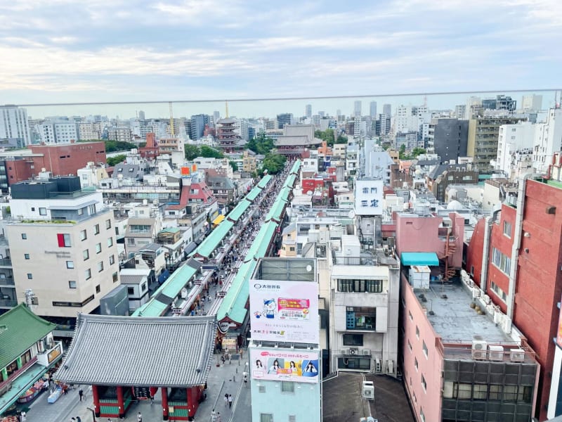 浅草文化観光センターの見どころは、最上階の展望台。無料で入れる展望台はオープンテラスとなっており、東京スカイツリーや仲見世通りなど、浅草の主要観光地が一望できます。