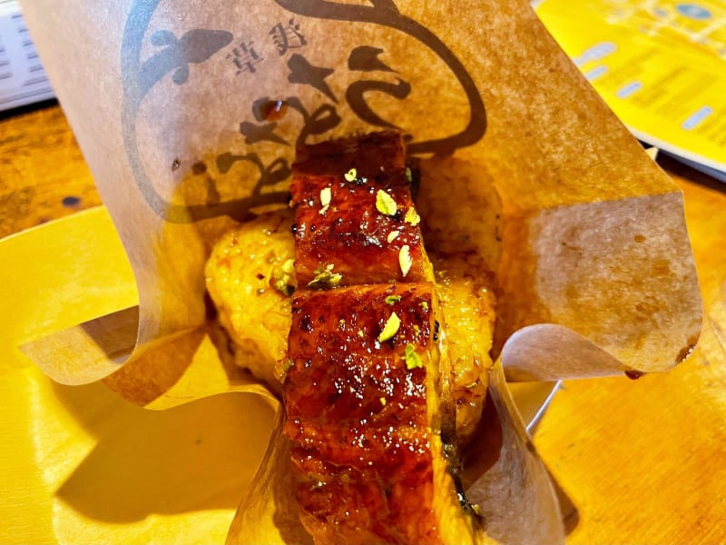 浅草うななの看板メニュー「国産鰻 焼きおにぎり」は、おにぎりからはみ出すほどの大きなうなぎがのっているのが特徴。その他、定番のうな重やうなぎの蒲焼、うな肝のアヒージョなどのメニューも揃っています。