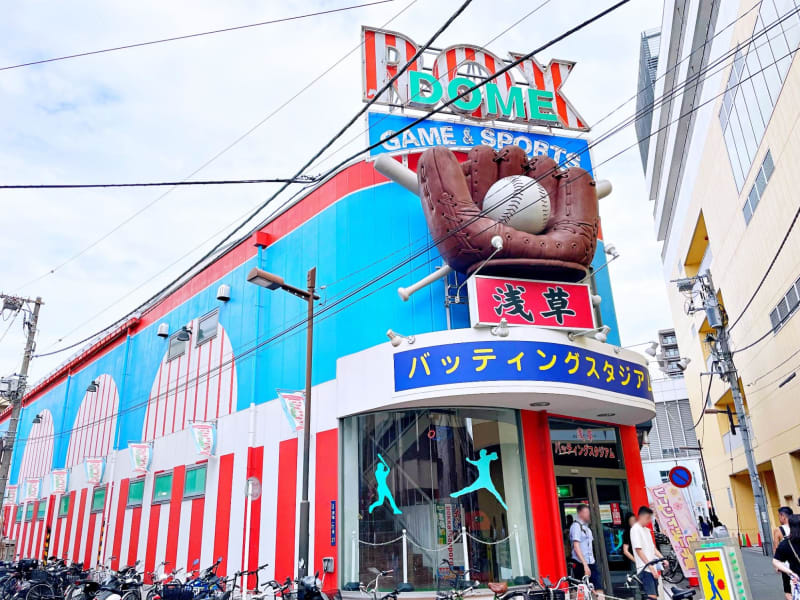 思わず写真を撮りたくなる迫力満点のグローブとバットの外観が印象的なバッティングセンター『浅草バッティングスタジアム』。