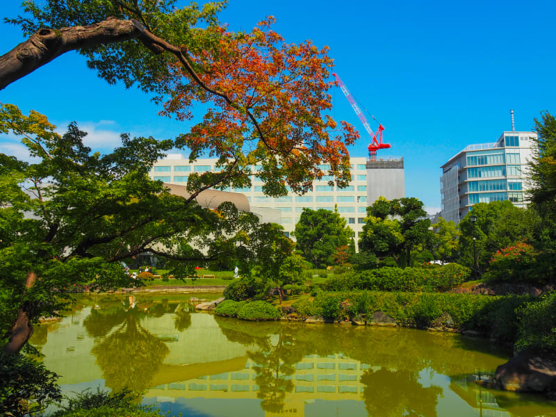 東京都の名勝に指定されている『旧安田庭園』。心の字をかたどった「心字池」が庭園内の中心にあり、回遊式庭園として自然豊かに整備され美しく保たれています。