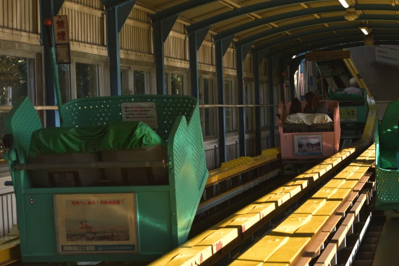 園内への入場はアトラクションさながらの乗り物「カーレーター」で進みます。ロープウェイ山上駅から園内の頂上までゴトゴトと振動する“乗り心地の悪さ”こそが魅力。