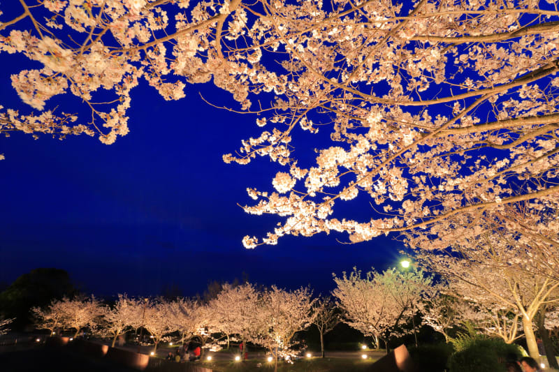 昼間の桜に加え、日が落ちると浮かび上がる夜桜は幻想的。平成25年からはライトアップも実施されており、2023年の春には源平ゆかりの地にちなみ「敦盛桜」という関西最大級の夜桜イベントが開催されました。