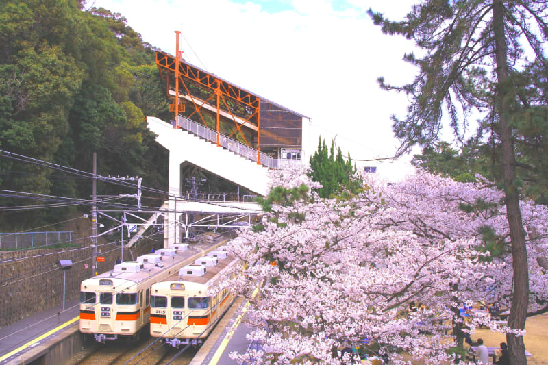 山陽電車が近くを走っているので、桜と海、電車を入れたユニークなショットや、ロープウェイのレトロな建物と桜を一緒に切り取る写真も狙ってみて。撮影を満喫したあとに桜の木の下でお花見できるのも魅力です。