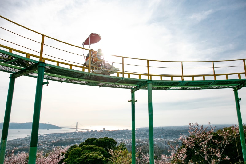 園内のアトラクション「サイクルモノレール」は、自分の足でスピード調節する2人乗りの自転車で地上3〜8mの絶景で空中散歩を楽しめます。淡路島や明石海峡大橋の望む景観を心のファインダーにおさめて。