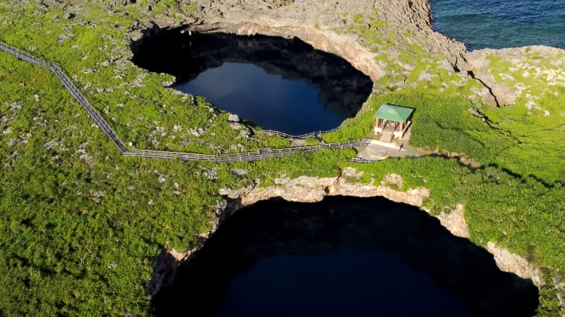 伊良部島の西にある下地島に位置し、通り池は2つの池からなる『下地島 通り池』は、古くから伝説が残る神秘的な池。ゴツゴツとした鍾乳石があたり一帯に広がり、水面はコバルトブルーの深い青色をしているのが特徴です。