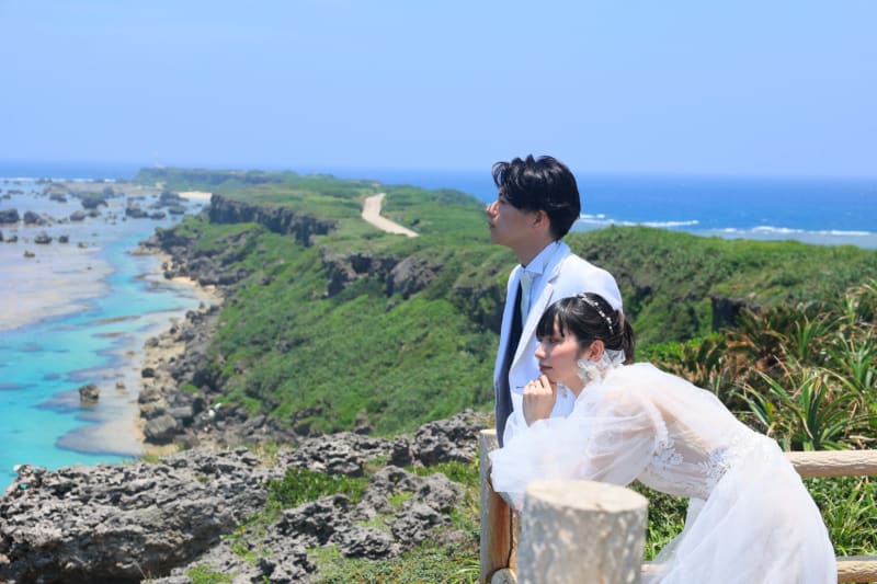 見渡す限りのエメラルドグリーンの海が美しい『東平安名崎』は、フォトウェディング撮影にもおすすめ♪ エメラルドグリーンの海と青い空、そして純白のウェディングドレスのコントラストが忘れられない思い出になりますよ。