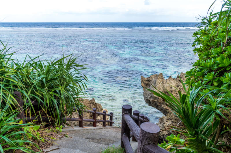 海に続く階段に腰かけて、大小の岩とサンゴが点在する海を眺めながら、ピクニック気分でゆっくりとランチやコーヒーブレイクを楽しんだりするのもいいですね。近場には、断崖絶壁の展望スポット『フナウサギバナタ』もあるので一緒に訪れてみても、いいかもしれません♪