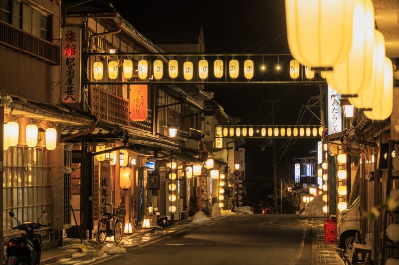吉野郡天川村にある『洞川温泉街』は、旅館や飲食店、お土産店などレトロな外観のショップが軒を連ね、どこか懐かしい雰囲気が漂うエリア。夜になると、街中の提灯にあたたかな明かりが灯り、より一層趣きが感じられます。
