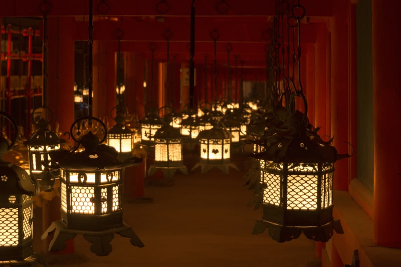 そんな春日大社では、毎年2月の節分の夜に「節分万燈籠」が行われます。境内にある約3,000基の灯篭すべてに明かりがともり、やわらかなオレンジ色の光に包まれます。この灯篭は、平安末期から現在まで家内安全や商売繁盛、先祖の冥福向上などの願いを込めて寄贈されたもの。