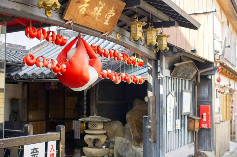 ならまちの民家や商家の軒先でみかける、赤い布の飾り「身代わり申」も、ならまちならではの光景。「庚申さん」のお使いだったサル形のお守りは、災いを代わりに受けてくれると言われています。