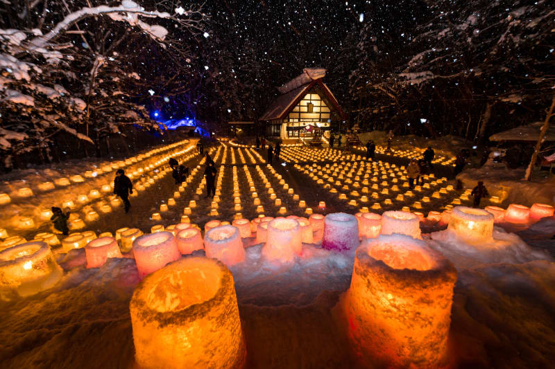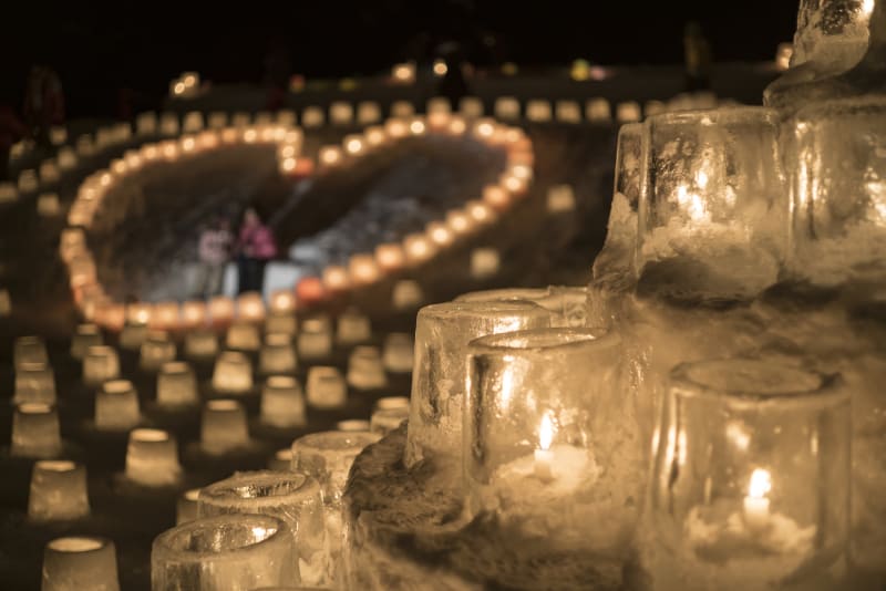 冬の定山渓神社をあたたかい光で彩るイベント『雪灯路(ゆきとうろ)』。スノーキャンドルのエリアをぬけると、自然と光・映像が融合した神秘的な森「祈りの森」エリアが出現。