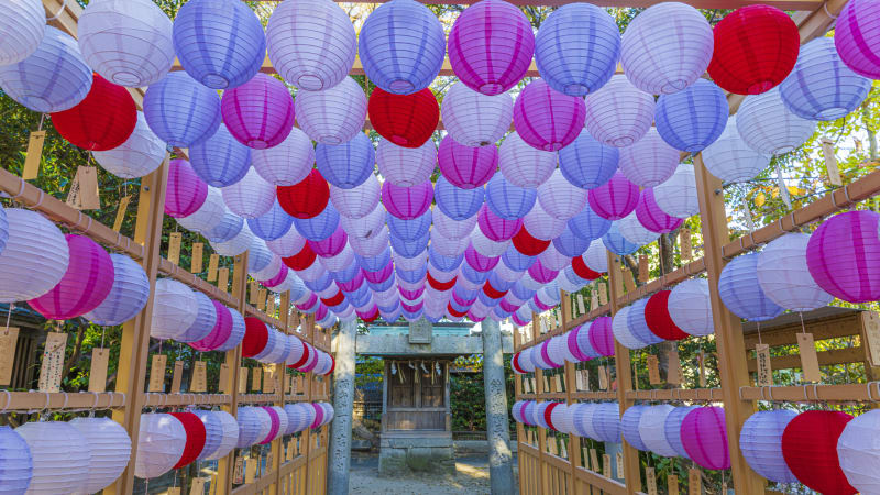 商売繁盛や就職祈願などができるとともに、恋愛祈願をしたい人や円満成就を願うカップルにとてもおすすめなのが、赤、ピンク、ラベンダーの3色のぼんぼりがアーチ状の木枠に無数に付けられている恋ぼんぼり。中を歩くだけで恋する気分が高まり、また、華やかなぼんぼりはSNS映え間違いなしなので、撮影をするもよし。