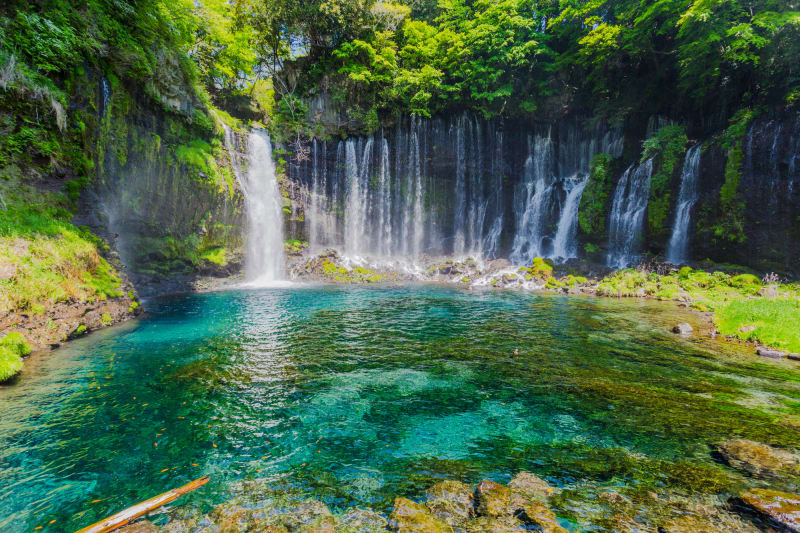 『白糸の滝』は、世界遺産・富士山の構成資産のひとつで、国の名勝および天然記念物にも指定されています。その名の通り、白い絹糸のような繊細な水の流れが見どころ! 富士山の湧き水が、高さ20メートル、幅150メートルに渡り流れ落ちてゆく滝は息をのむほどの美しさです。
