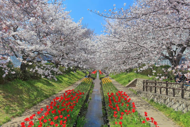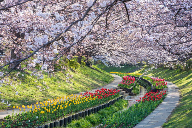 足元にはチューリップが植えられており、色とりどりのチューリップと桜の共演が見られるのは江川せせらぎ緑道ならでは。桜の見ごろは例年3月下旬から4月上旬。お花見がてらに、ゆったりと散策するのがおすすめですよ。