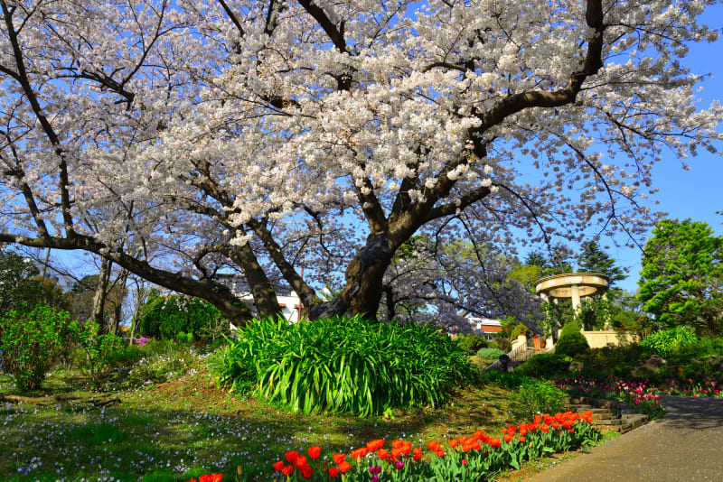 園内の桜の本数は多くはありませんが、大きな枝ぶりで、どれも見ごたえ抜群。ローズガーデンでは大きなソメイヨシノとのコラボレーションが楽しめます。