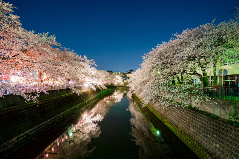 夕方ころからは、川沿いのぼんぼりに灯が点り、幻想的に夜桜をライトアップ。昼間の桜とはまた違った魅力で、デートにぴったりなロマンチックな雰囲気で過ごせますよ。