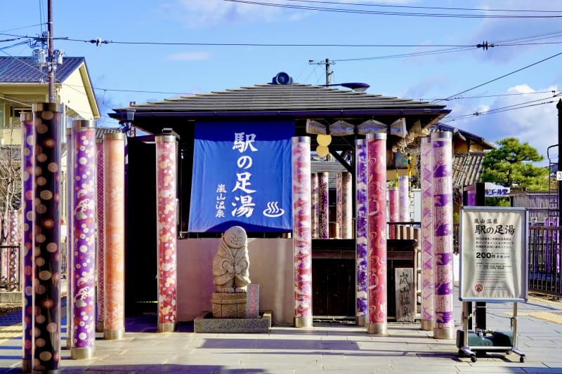 嵐山駅には、昼夜問わずヴィレッジのように楽しめるよう足湯も完備。料金にタオルが含まれるので、手ぶらでも気兼ねなく入れます。もちろんキモノフォレストも眺められるので、散策で疲れた足を癒しつつ美しい光景を楽しみましょう。