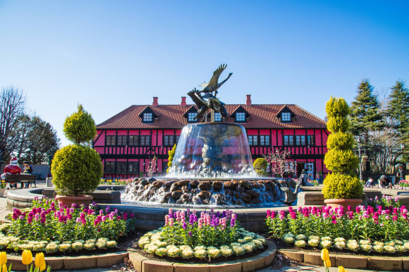 園内には5つのゾーンがあり、童話のイメージが広がる「メルヘンの丘ゾーン」はフォトウェディングにぴったり。アンデルセン童話「みにくいアヒルの子」が白鳥になって飛び立つ瞬間を切り取った噴水は、季節の花々に囲まれ華やかな1枚に仕上がります。夏のひまわり、秋はコスモス、冬はアイスチューリップが満開に♪