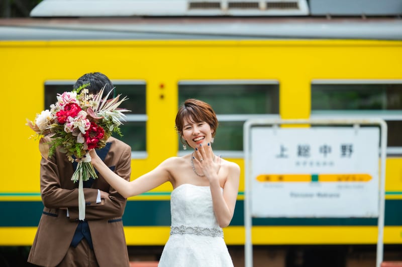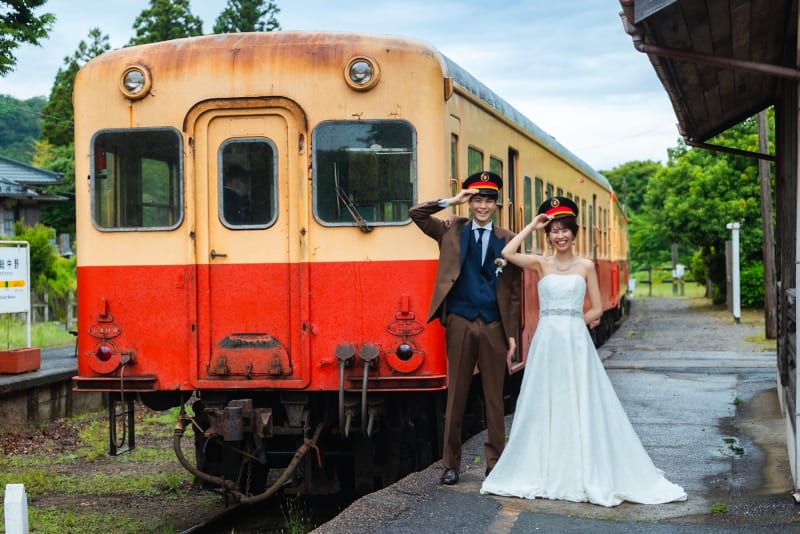 大正14年から続く『小湊鉄道』で、レトロで個性的なフォトウエディング撮影を。千葉県市原市にある「五井駅」から「上野中野駅」を結ぶ計18駅からなる路線で、鉄道内22施設が国の有形登録文化財に指定されています。長い歴史を感じさせる車両や駅舎が観光客からも人気で、春は菜の花畑の側を走る電車もフォトジェニック!