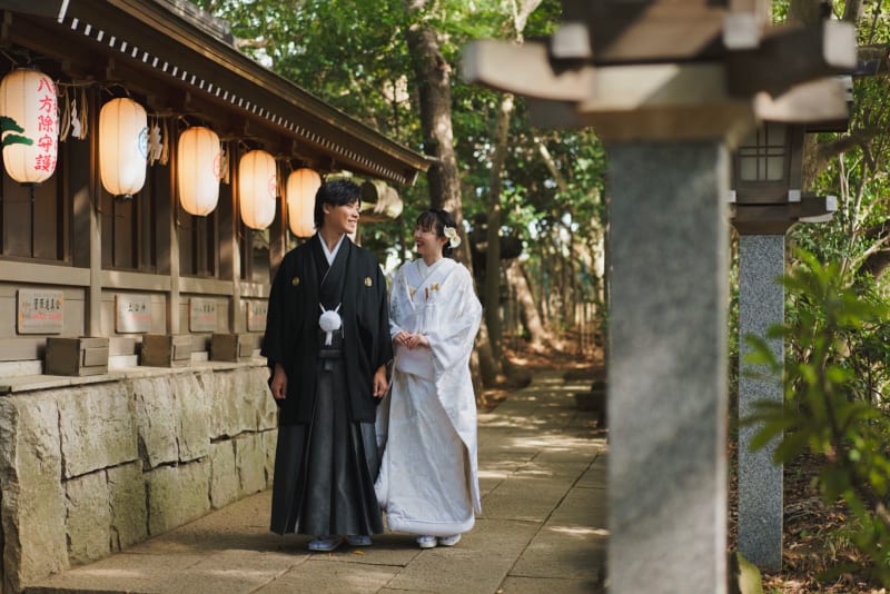 境内での撮影では、三柱の神様が見守る本殿前は外せません。本殿の建物は金色の装飾が施され、重厚感のある雰囲気。神前結婚式さながらに、白無垢と紋付袴姿で佇んでみて。縁結びのお社としても知られているので、スピリチュアルな力でおふたりの絆もさらに強いものに…♪
