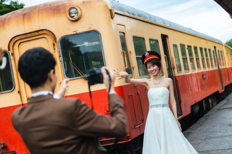 「キハ200形気動車」をはじめ、トロッコ列車や保存展示用のSL機関車など、さまざまな車両が走る小湊鉄道。個性的な電車をバックにした撮影は最大の魅力です。レトロな電車の前で、帽子を被ってポーズを決めてみて♪ 新郎様がジャケットにジレ、ネクタイといった出で立ちで車掌さんになりきるのもおすすめです。