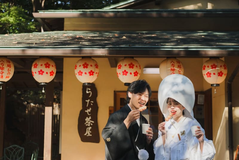 撮影の合間には、丸い提灯がシンボルの「うたせ茶屋」にも寄り道。店内ではあんみつやカレーといった甘味・軽食が味わえるほか、店頭では鍋いっぱいのタレにつかった玉こんにゃくが販売されています。日あたりが良く緑が生い茂るお店の前で、玉こんにゃくを頬張るユニークなショットも素敵♪
