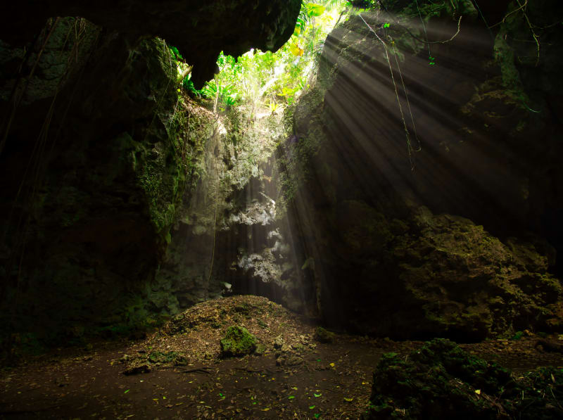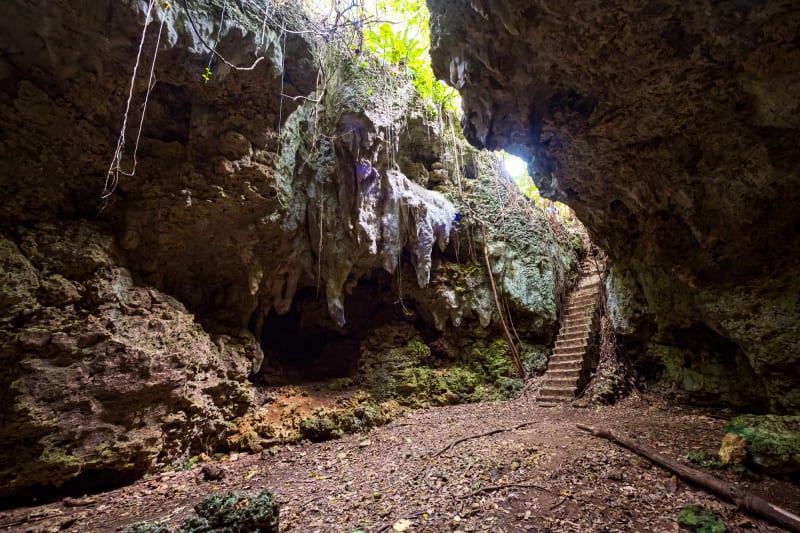 さとうきび畑を抜けると、ひっそりと鍾乳洞が現れます。『ヌドクビアブ』は、琉球石灰岩が長い時間をかけて溶けてできた洞窟で、木漏れ日が差し込む静かな雰囲気はとても神秘的。