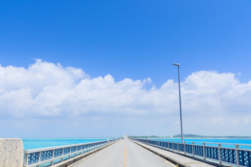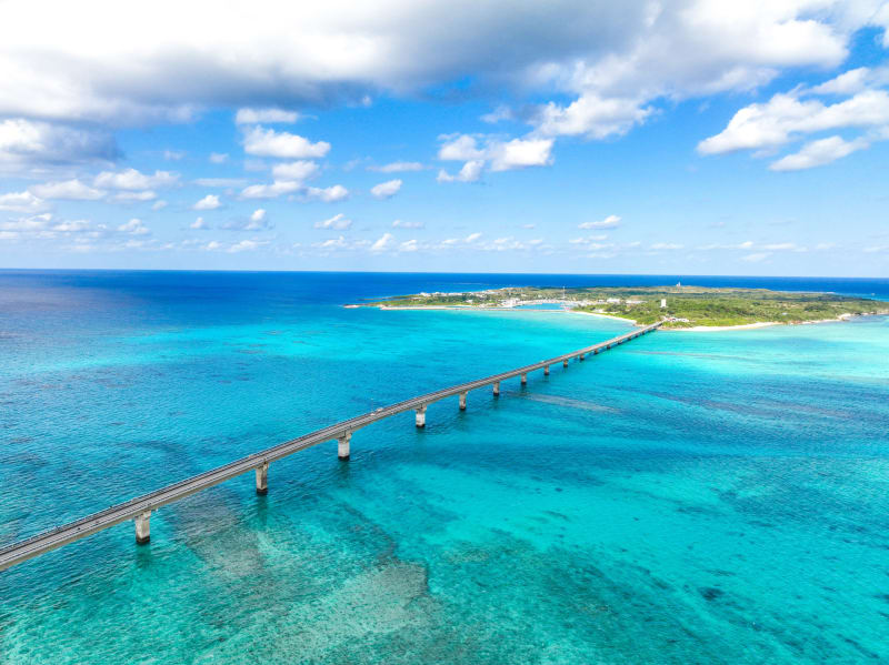 宮古島の北側にある周囲10キロほどの島「池間島」へ繋ぐ全長1,425mの橋『池間大橋』。池間島周辺はサンゴ礁がとても豊かで、「池間ブルー」と呼ばれる透明度の高い美しい海が広がります。