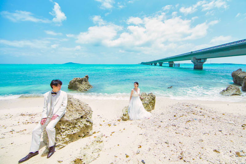 来間島の『ムスヌン浜』は、琉球石灰岩の岩場が続く絶景スポット。比較的訪れる人も少なくプライベート感満載。静かな場所でゆっくりと過ごしたいふたりにぴったりのビーチです。