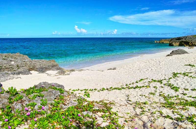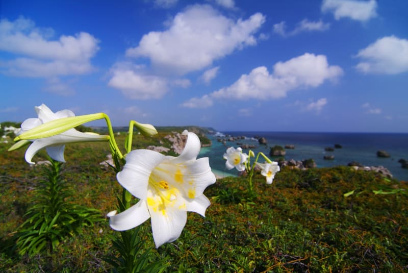 大自然が広がる東平安名崎一帯の植物は県の天然記念物に指定されています。4月~5月頃にはあたり一面にテッポウユリの白い花が咲き誇ります。街の中心部とはまた違う、ゆったりとした空気を感じられますよ。