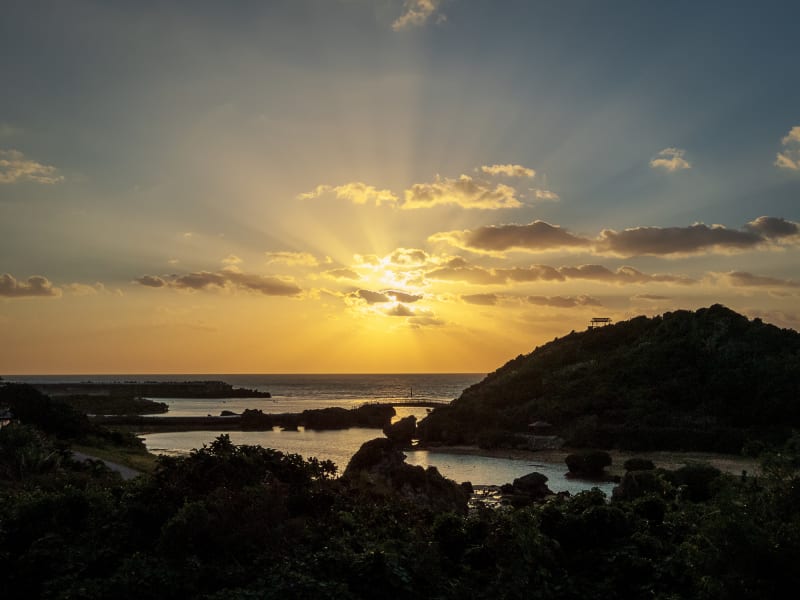 来間島の西側に位置するムスヌン浜は、夕日が美しいことでも有名。海に沈む夕日をゆっくりと眺めるのもおすすめの過ごし方ですよ。さらに、周辺には明かりがほとんどないため、満天の星空が見られることも! 波の音を聞きながら星空観察もおすすめです♪