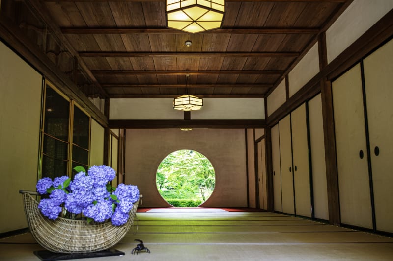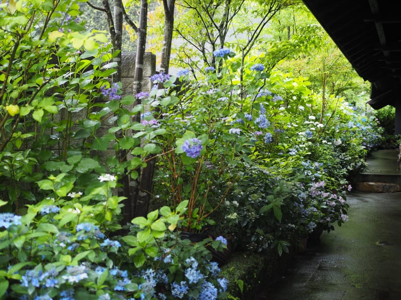あじさいの名所として知られる境内には、鮮やかなあじさいが連なり、その美しさは「明月院ブルー」とも言われるほど! 自然豊かな緑があふれ、歩いているだけでも心が癒されます。境内には枯山水庭園やカフェもあり、ゆっくりと過ごすにはぴったりの雰囲気。
