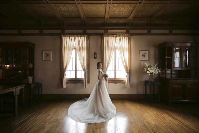 アンティークなものに囲まれた落ち着きある空間は、シンプルなドレスとマッチし、重厚感のある一枚に仕上がります。