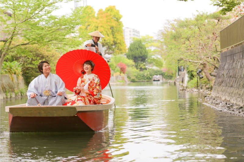 城下町を眺めながら水路をめぐる「川下り」は、「川上り」とも呼ばれ昔から柳川に伝わる婚礼儀式のひとつ。福岡県下で一番の本数を誇る桜が彩りをくわえ、より華やかな雰囲気の中、多くの方がフォトウェディングを行っています。城跡もあり石垣などが残るタイムスリップしたかのようなエリアは、和装で散策するのにぴったりですよ。