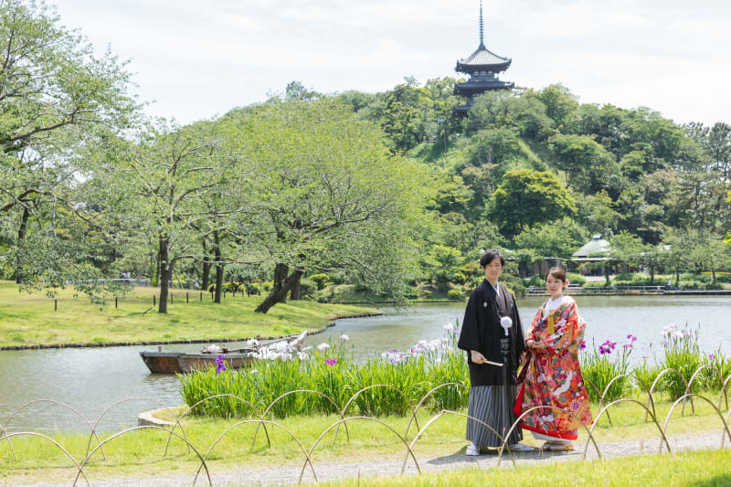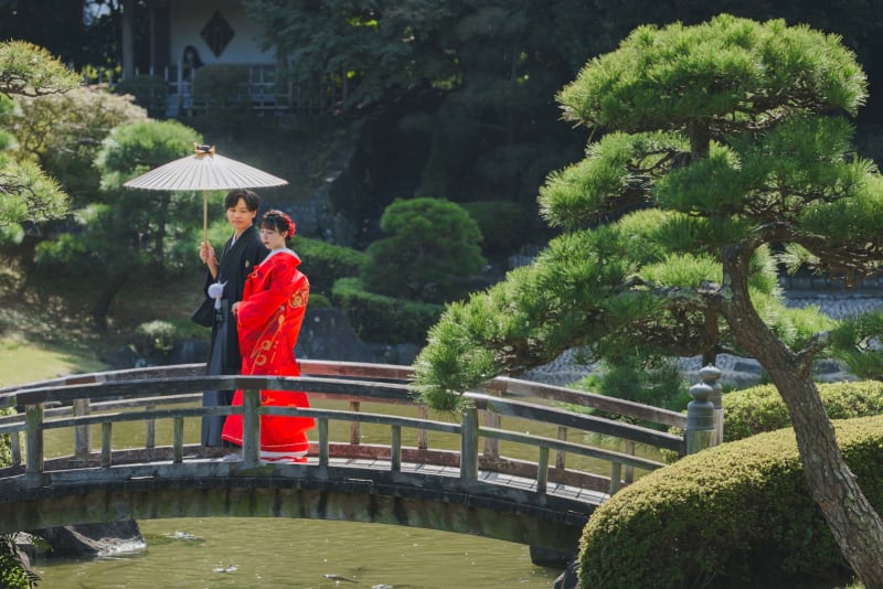 「日本の庭園100選」に選ばれる名園『見浜園』。園内には太鼓橋の雪吊りなど日本の四季を堪能できる光景が広がります。幕張海浜公園内にあるためアクセス良く、日本庭園を巡れるのもポイント!落ち着いた和の雰囲気には鮮やかな和装がマッチします。