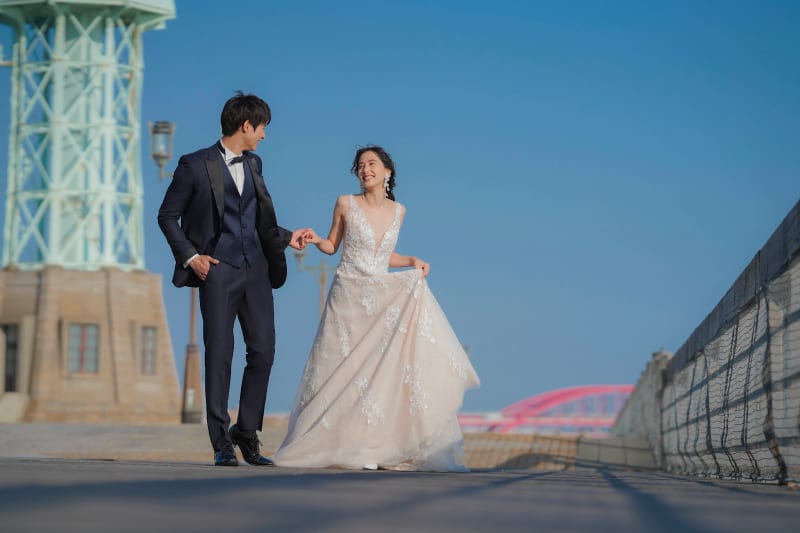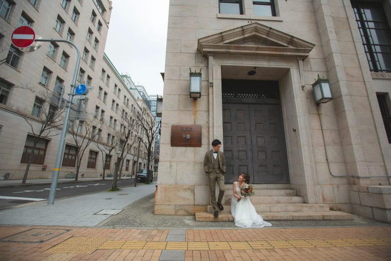 外国人住居が色濃く残り、海外のような街並みでは雰囲気正統派のドレス&タキシードに普段使いの小物を合わせてカジュアル感をプラス、おしゃれな撮影をしてみて。