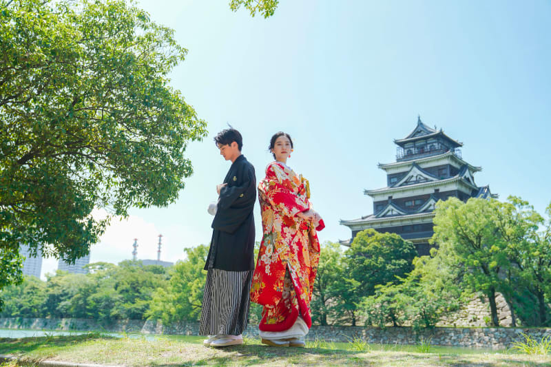 フォトウェディングでは王道の和装でばっちり決めて、広島城の殿と姫になったような一枚を♪