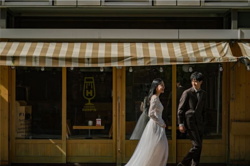 近くをレトロな路面電車が走っていたり都会的な建物、季節を感じられる木々もたくさんあるので、フォトウェディングにもおすすめ。普段着に近いカジュアルな衣装で、日常感を出すのが今どき撮影スタイル。