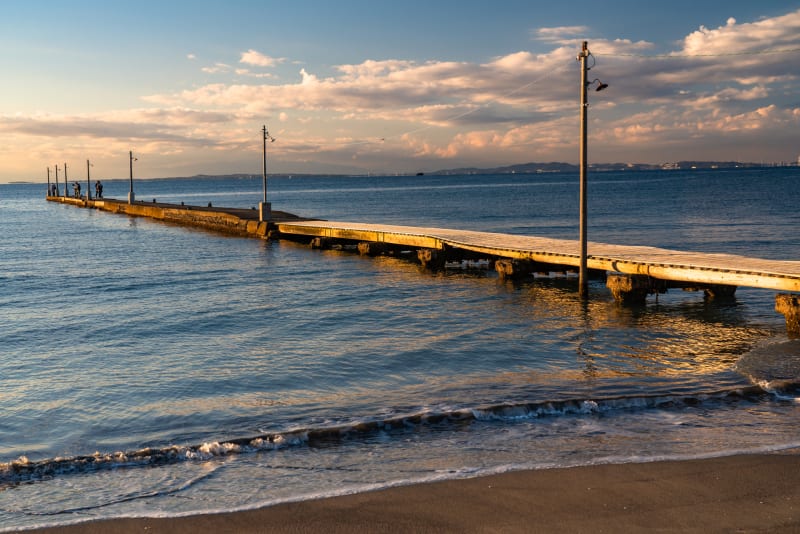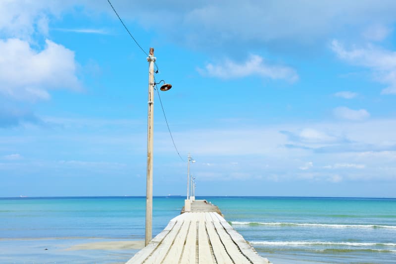 海をバックにした桟橋と電信柱でさながらシネマのワンシーンのような情緒あふれる景色が広がるこの場所。映画やドラマ、ミュージックビデオに出演しているような気分でポーズや角度を決めて、とっておきの一枚を狙ってみて。
