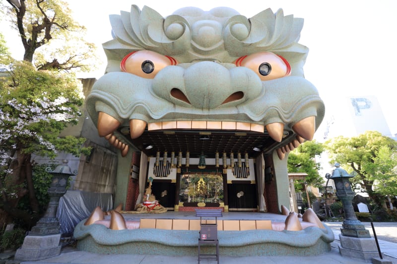 本殿参拝の後は、難波八阪神社のシンボル「獅子殿」とご対面。高さ12mにも及ぶ巨大な獅子の口の中に、社殿がすっぽり収まっています。その迫力ある姿は、外国人観光客からも大人気!獅子の口から邪気を吸い、勝運をもたらすといわれているので、ぜひ手を合わせてみて。