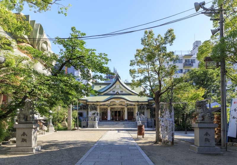 『道頓堀』から一歩足を伸ばして、次は『難波八阪神社』に向かいましょう。総本山は京都にある八坂神社ですが、大阪・難波の地に根差す神社。御祭神は、日本の神話でも有名な素戔嗚尊(すさのをのみこと)とその妻、奇稲田姫命(くしいなだひめのみこと)、そしてその子どもである八柱御子命(やはしらのみこと)。厄除けや疫病退散、縁結び、夫婦円満のご利益を授かれるよう、まずは本殿を参拝しましょう。