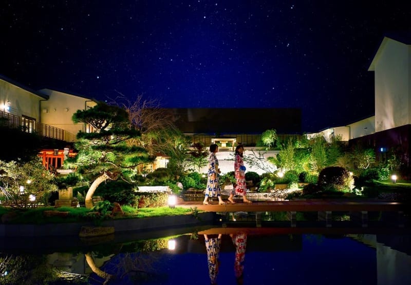水の神様をお祀りする弁天町にある温泉施設で、館内はタイムスリップしたかのような昔懐かしい雰囲気。メインの温泉では、源泉かけ流しの露天風呂をはじめとする、9種類の天然温泉が楽しめます。よりプライベートな時間を過ごせる坪庭付きの貸切露天風呂も10室用意されています!