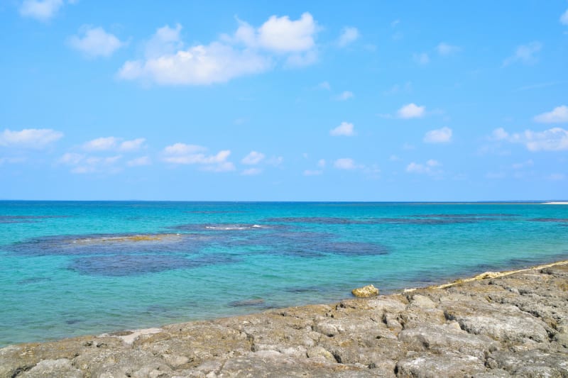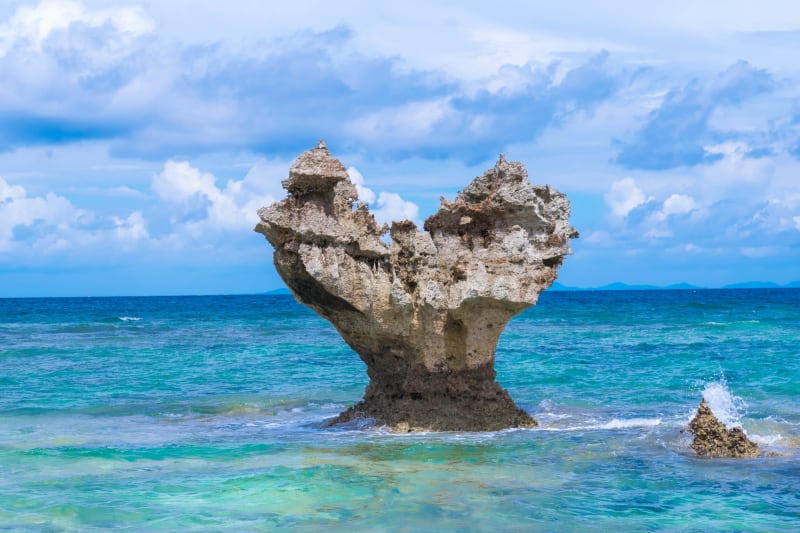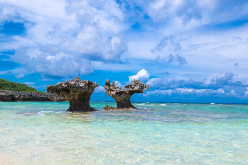 古宇利島の北側に位置する天然のビーチ・ティーヌ浜。自然が作り出したハート型の岩『ハートロック』が並ぶ様子が、インスタ映えすると注目を集めています。