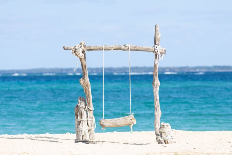 砂浜にある木製のブランコは、人気のインスタ映えスポット。ブランコに乗って開放的な景色を背景に撮影してみて!