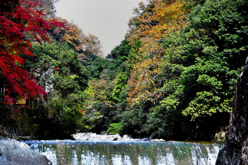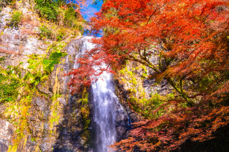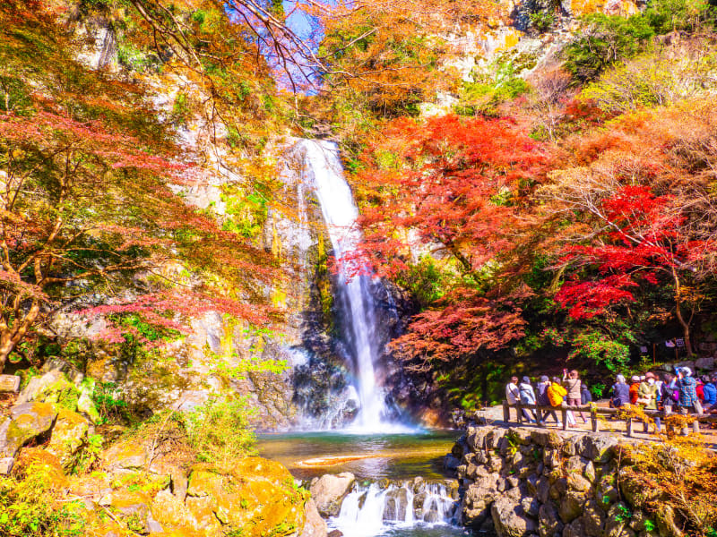 紅葉シーズンの園内は、落差約33mの「箕面大滝」を囲む樹木が赤や黄色のグラデーションへ彩ります。大自然が織りなす色合いと川面に映し出される紅葉の絶景に圧倒されるはず!