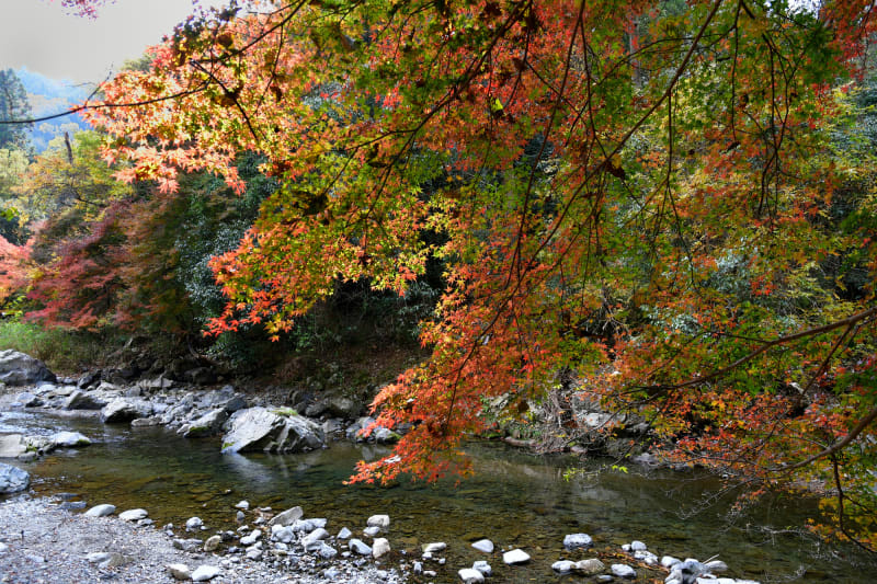 園内には「もみじ谷」と呼ばれる知る人ぞ知る紅葉の穴場があり、山一面に広がるもみじはここでしか見られない景色。大阪都心からすぐの場所にありながら、鳥の声や清流の音を聞きながら散策できる癒しのスポットです。