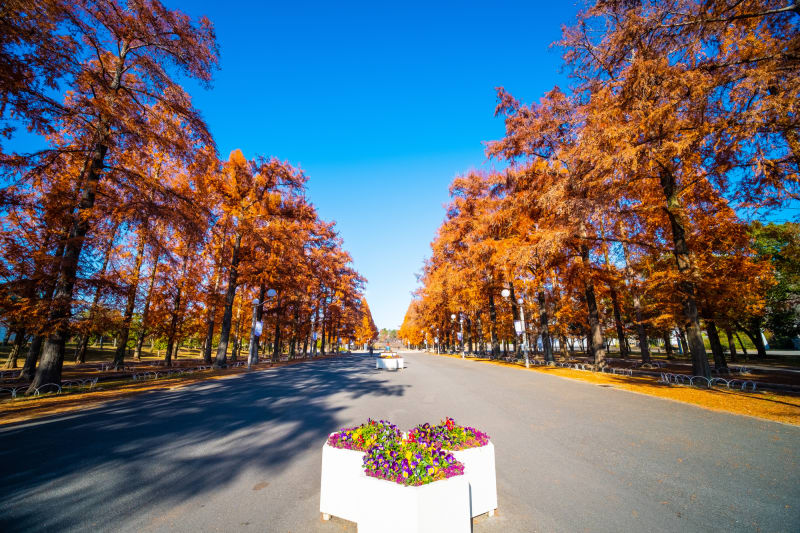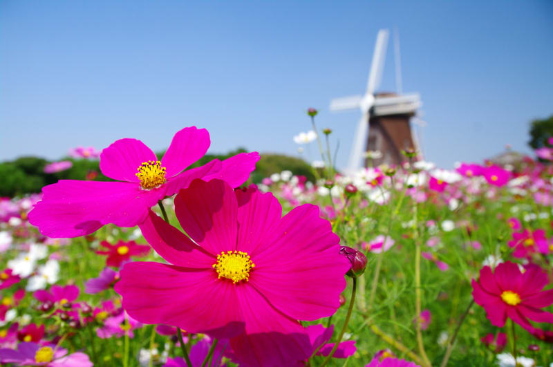 春夏にはネモフィラやチューリップ、ヒマワリなどが咲き誇る「風車の丘」では、秋にはコスモスやサルビアが見ごろを迎えます。ケヤキが紅葉しオレンジの街路樹になる「けやき通」も魅力のひとつ。